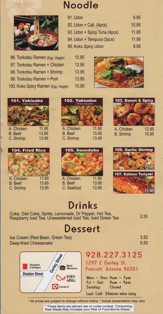 Introducing the menu at KoKo Grill, located in Prescott, AZ, offering a variety of sushi and sashimi combinations. The Sushi Combination includes options like Roll Combo, Sushi & Sashimi Combo, Sushi Roll Combo, and more. Sushi options range from Salmon to Yellowtail, while the Sashimi Sampler offers a taste of different fish. Customers rave about the fresh and delicious Japanese dishes, praising the service and ambiance of the restaurant. Reviews highlight the flavorful KoKo Spicy Udon, Unagi Dragon Roll, Garlic Shrimp, and more. With reasonable prices, generous portions, and a cozy atmosphere, KoKo Grill is a must-visit for sushi lovers. Don't miss out on their all-you-can-eat sushi specials on Saturdays.