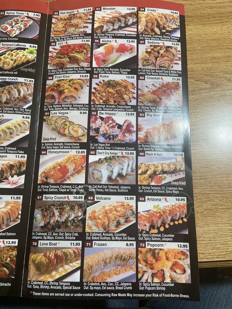 Spicy. This item is served raw or undercooked. Consuming raw meats may increase your risk of foodborne illness. In: Cali roll. Out: seared tuna and white fish, lemon, poki sauce, Sriracha, scallions.